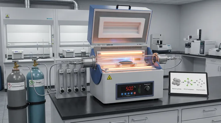 核心要点 该系统依赖于通过1,2-二氯乙烷在500°C下的热解原位生成氯物种。这种受控释放对于创造特定的化学环境至关重要——特别是Pt-O-Cl络合物——这是将聚集的铂颗粒重新分散到原子尺度所必需的。