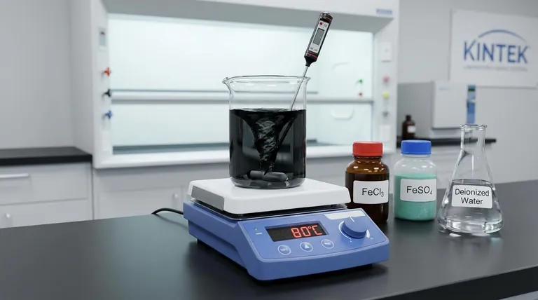 带磁力搅拌的加热设备是成功共沉淀Fe3O4纳米颗粒的主要控制机制。通过同时维持80°C的恒定温度并提供高强度的机械搅拌,该设备确保铁前驱体——FeCl3和FeSO4——充分分散并在均匀的条件下反应,以产生一致的结果。