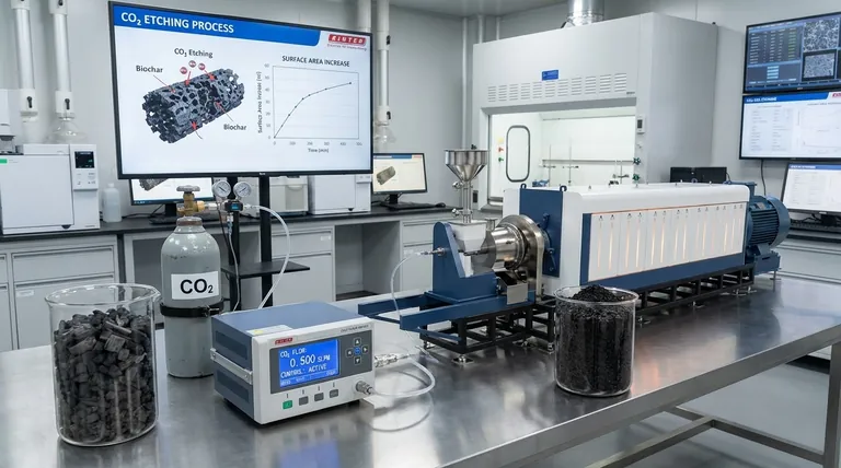 二氧化碳和精确流量计的结合是将标准生物炭转化为高性能材料的关键因素。流量计调节 CO2 向高温区的输送,在该区域,气体充当“蚀刻剂”,物理上雕刻生物炭的内部结构,从而显著增加其表面积。