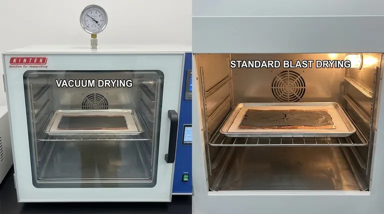 核心要点 真空干燥优于标准喷射干燥的根本优势在于消除了“表面结皮”效应。通过降低沸点,真空烘箱允许溶剂在表面硬化之前从浆料孔隙深处逸出,确保粘合剂分布均匀并防止结构开裂。