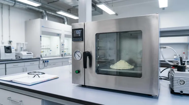 使用真空干燥箱至关重要,可以降低材料中残留溶剂的沸点。通过降低环境压力,可以迫使四氢呋喃和甲醇等溶剂在仅70°C的温度下快速挥发,确保它们从TF-COF的纳米孔中去除,而无需使用破坏性的高温。