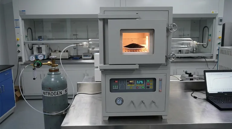 引入氮气流的主要目的是作为惰性保护罩。通过在管式炉内,特别是在 450°C 的高温煅烧过程中置换氧气,氮气可防止碳材料与空气发生反应。这可以防止原材料燃烧成灰烬(氧化燃烧),同时允许必要的内部化学变化安全地发生。