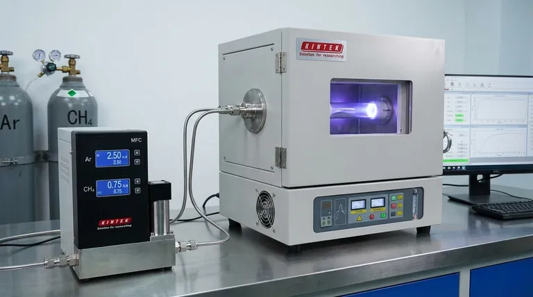 MFC 负责精确混合载气氩气 (Ar) 和反应性气体甲烷 (CH4)。
