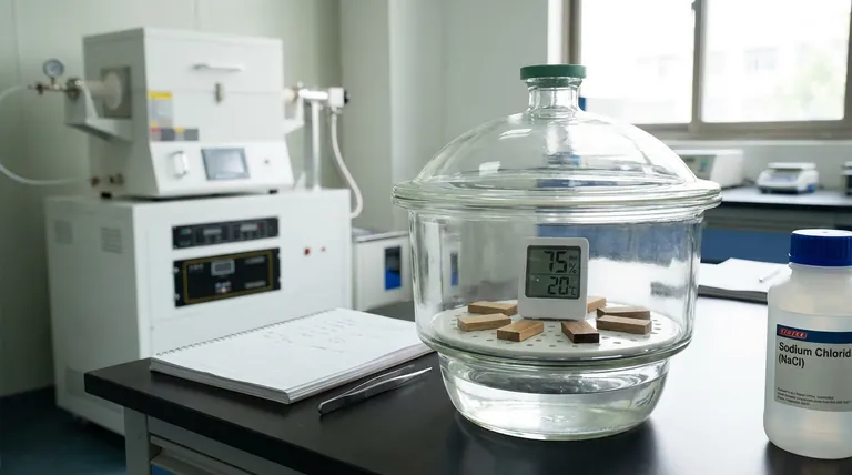 使用含有饱和盐溶液的干燥器是为了产生化学稳定、不变的相对湿度环境,这对于标准化的木材科学测试至关重要。这种方法使研究人员能够将改性木材暴露在精确的湿度条件下——例如 75% 或 98% 的湿度下——从而准确确定其吸湿特性,而不会出现机械气候室固有的波动。