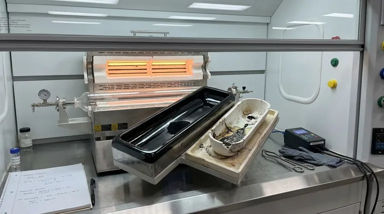 选择玻璃碳舟而非标准氧化铝坩埚是由于在此合成中使用的碱金属氢氧化物-碘化钠助熔剂具有极强的化学腐蚀性。虽然氧化铝适用于许多反应,但它在暴露于这种特定的高活性熔融盐混合物时会迅速降解。玻璃碳提供了必要的化学惰性,以防止容器与助熔剂发生反应并污染最终产品。