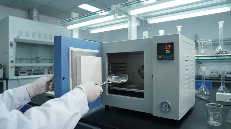 核心要点 100°C 的处理是形态控制步骤,而不仅仅是干燥方法。通过快速去除 DMF 溶剂,您可以有效地将纳米纤维素和聚丙烯腈 (PAN) 复合网络“冻结”在原位,防止在缓慢的常温干燥过程中发生的结构变形。